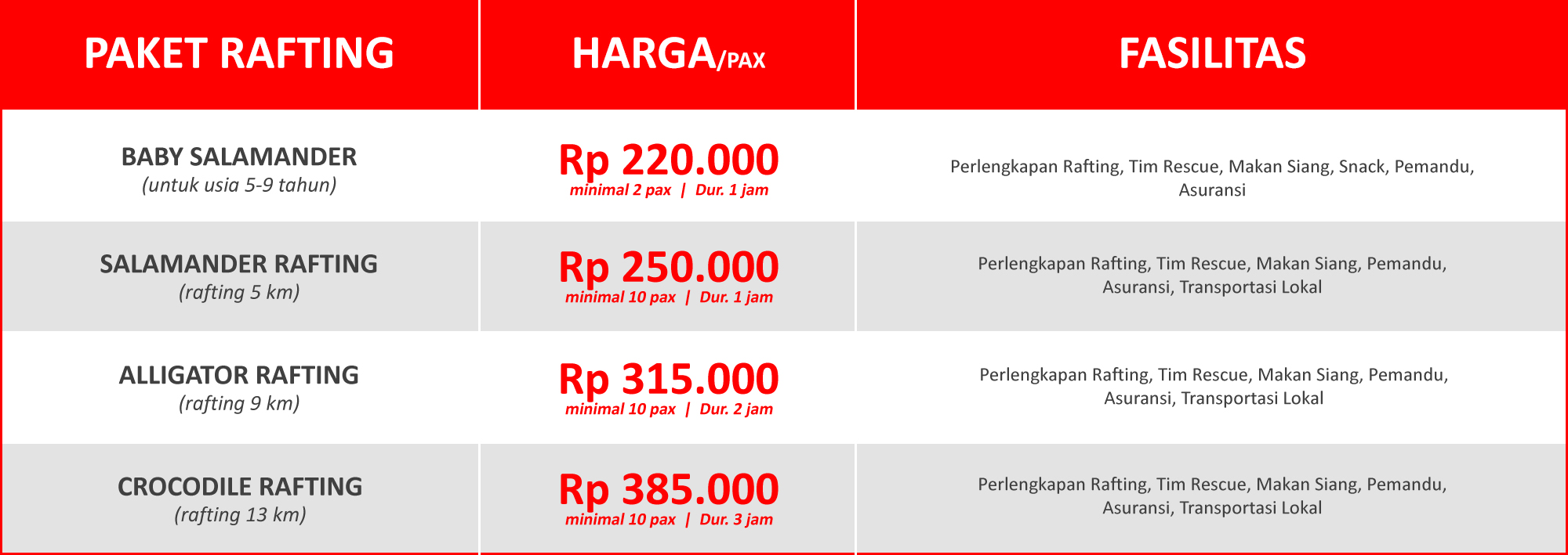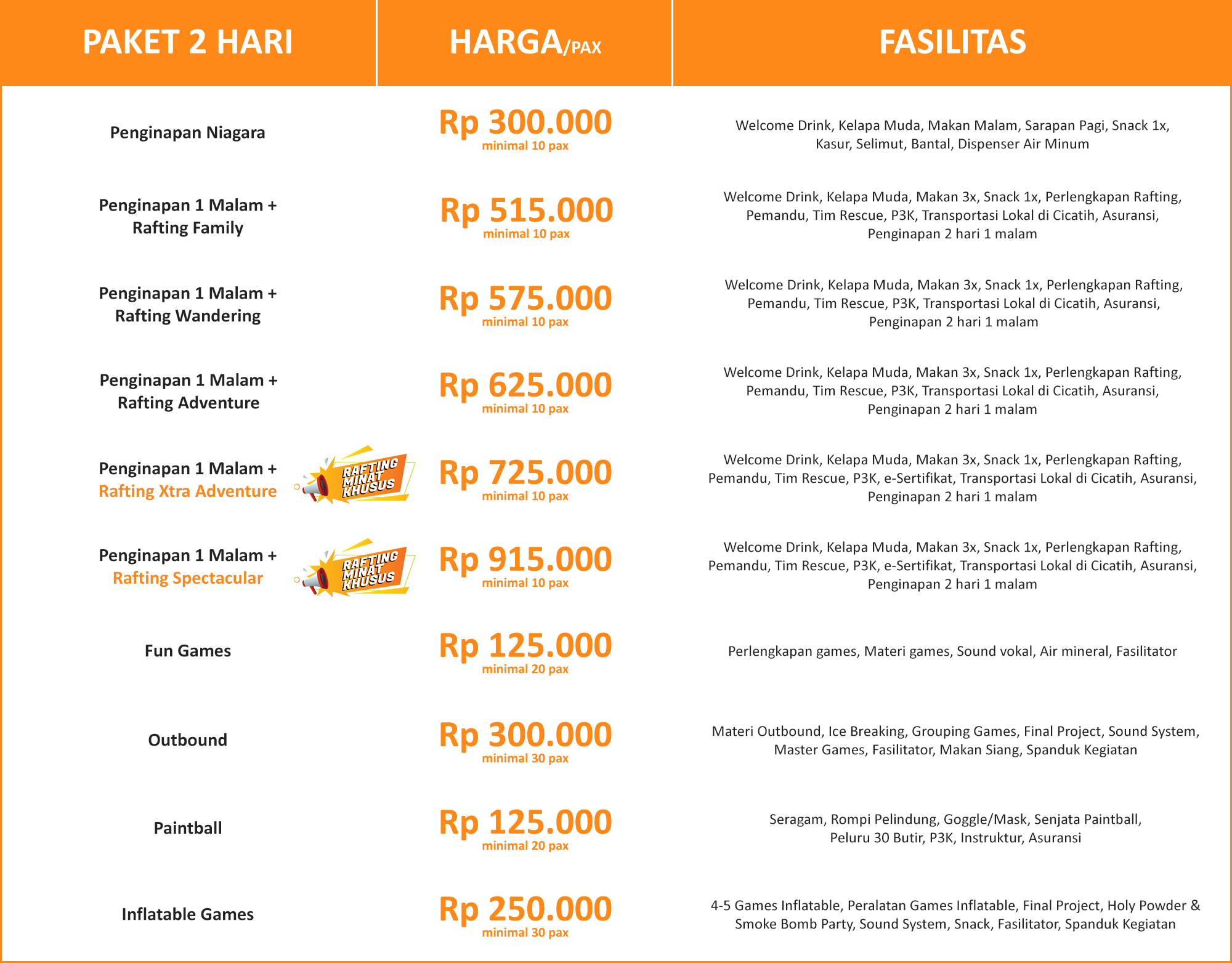 Ada beberapa pilihan trip rafting yang ditawarkan di sungai Citatih, buat yang suka tantangan bisa mencoba Adventure Trip 12 km, bagi yang bersama keluarga besar ingin bermain rafting yang tingkat jeramnya aman untuk anak-anak bisa mencoba Family Trip 9 km. Selengkapnya berikut pilihan paket kegiatan Niagara Adventure di sungai Citatih.